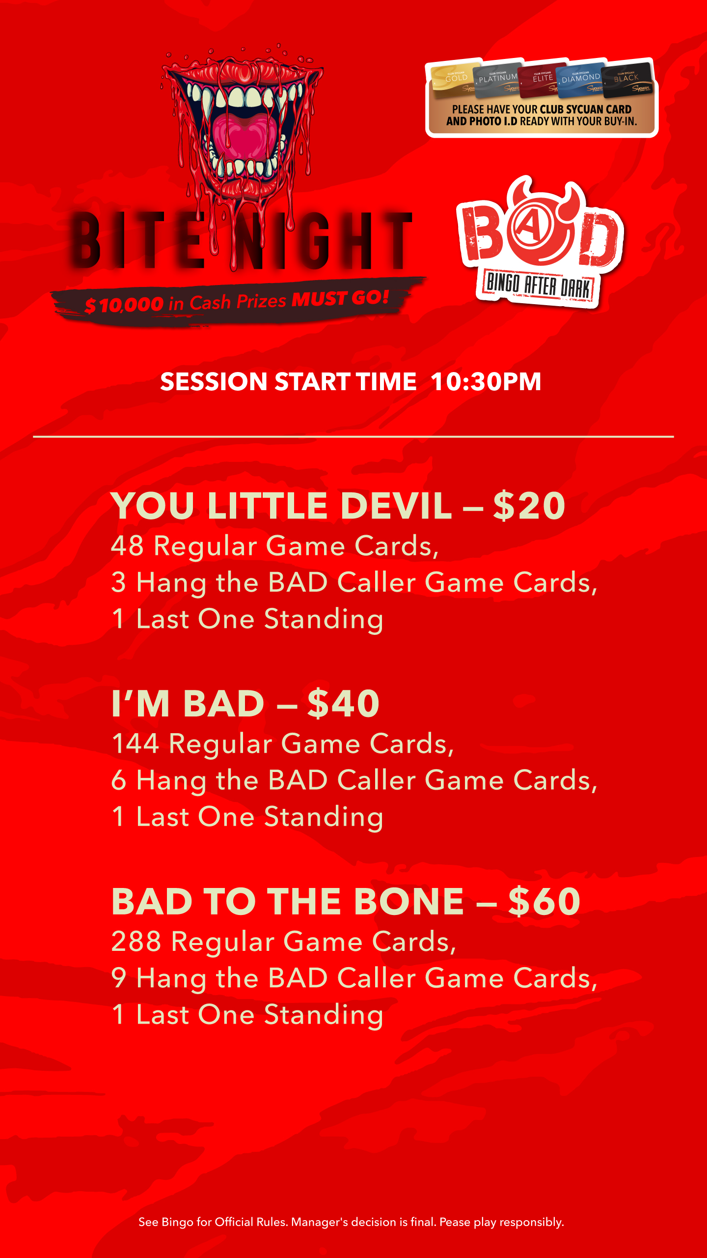 BAD Bite Night! Saturday, February 28 | 10:30PM $10,000 in Cash Prizes Must Go! • Dress up and participate in our 360-photo booth! • $25 Deposit to reserve a BAD table for 10 and receive glow items • $50 Deposit to reserve a BAD table for 10 and receive glow-in-the-dark items, BAD t-shirts, $50 in dining credit for food or alcohol, and 48 additional Level 1 cards with your minimum buy-in! Deposits do not include bingo buy-ins for $50 deposits Each group of 10 will require an additional deposit For more information, contact Sycuan Bingo at (619) 445-6002 ext. 1159 BUY INS SYCUAN CASINO MORE PROMOTIONS Table Games Bonus Spin Blackjack LEARN MORE Complimentary Sycuan App Complimentary Sycuan Mobile App LEARN MORE Every Wednesday $5 Buck Wednesdays LEARN MORE On your Birthday! Happy Birthday! LEARN MORE VIEW ALL PROMOTIONS Gold† Membership Sign up for a Club Sycuan card today and you’ll automatically become a Gold cardholder. Platinum Membership When you earn 10,000 points* you’ll have access to all the casino benefits of the Gold card plus additional discounts at all our restaurants and more. Elite Membership Unlock even more casino rewards when you earn 65,000* points and receive Elite cardholder status. Diamond Membership Once you earn 200,000 points* you’ll receive cash back with as little as 2,000 points earned plus incredible offers & discounts. Black Membership Reserved for our top-tier points players who earn 500,000 points*. You’ll receive the best of the best when it comes to casino rewards. HINT: CLICK THE CARDS TO LEARN MORE JOIN THE CLUB SYCUAN GET A CARD. GET REWARDED. LEARN MORE ABOUT CLUB SYCUAN