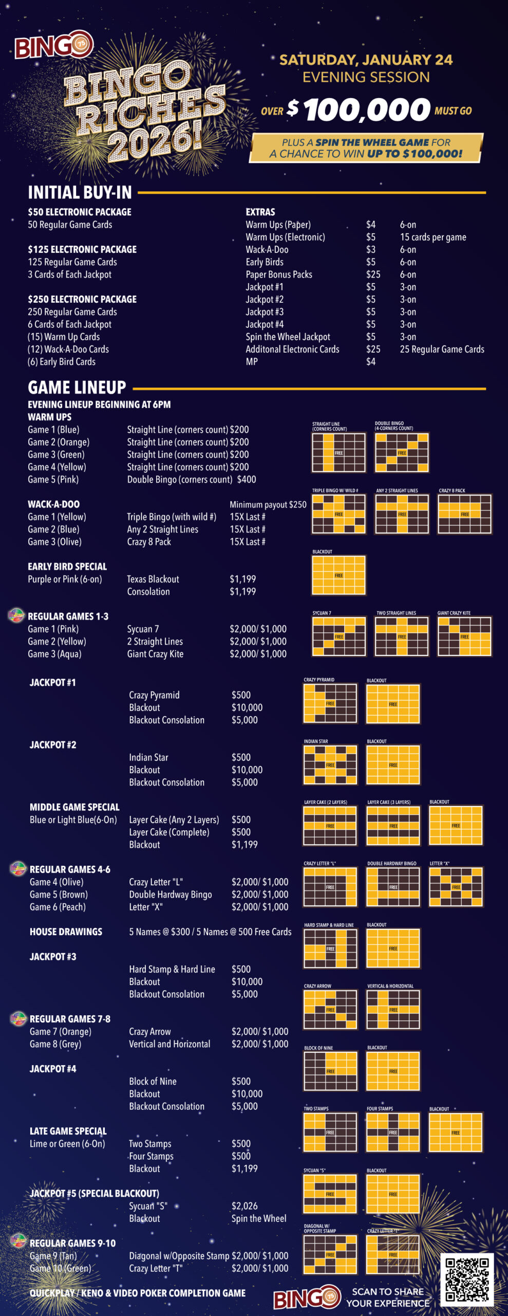 Bingo Riches 2026 Saturday, January 24 • Over $100,000 Must Go, plus a Spin the Wheel game for a chance to win up to $100,000! • Presales start on December 1 • Buy in early to reserve your seat! See Bingo for Official Rules. Manager’s decision is final. Please play responsibly. BUY-INS/LINEUPS EXPAND FOR OFFICIAL RULES Bingo Riches Spin the Wheel Game January 24, 2026 Rules 1. The “Spin the Wheel” game will occur during the Evening Session after the Late Game Special. 2. A Bingo buy-in receipt is required to participate in the “Spin the Wheel” game. Seats are limited to availability on the day of the event. 3. Players may purchase “Spin the Wheel” Game cards on PhD, MaxPak, or paper. A maximum of 2,000 cards can be played per electronic unit. 4. The winning player(s) must have the last number called for valid Bingo. Bingo numbers will be confirmed before the prize is awarded. 5. If there is more than one winner, the wheel spin amount will be split evenly among all verified winners. The winners will decide among themselves who will spin the wheel. If they are unable to agree, Bingo management will pick the winner to spin the wheel. 6. The player will spin the wheel, and when it comes to a complete stop, the one space that the ticker occupies will determine the player’s prize. The wheel must make at least two complete revolutions to be considered official. Only if the ticker is stuck between two prizes will the player spin again. 7. 24 prizes are displayed on the wheel. Amounts available are as follows: a. 1 slot – $100,000 b. 2 slots – $50,000 c. 6 slots – $25,000 d. 7 slots – $15,000 e. 8 slots – $10,000 8. All winners are responsible for any applicable taxes, tax forms, fees, gratuities and other government-imposed fees. If the cumulative total of the calendar year’s prizes should total $600 or more, a 1099 will be filed with the I.R.S. 9. The player must show Government issued ID and Club Sycuan card to claim the prize for record purposes. Bingo Management will fill out a winner’s log and send to accounting. 10. All promotions are open to Club Sycuan members only. Guests who are not members of Club Sycuan that would like to participate in any promotion can sign up for free to become a member at any Club Sycuan desk in the Casino. 11. You must be 21 years of age or older and have a current government-issued picture ID, to become a Club Sycuan member. You must have an initial Bingo buy-in to participate in bingo promotions. 12. Employees of Sycuan Casino Resort, Singing Hills Golf Resort at Sycuan, or Sycuan Gaming Commission, are not eligible for any Sycuan Casino Resort promotion. All licensed vendor employees who have been issued a permanent badge cannot participate in any Sycuan Casino Resort promotion while they are assigned to work at Sycuan Casino Resort. It is the responsibility of the player to apprise the promotion team that they are not eligible for the promotion. Failure to do so may result in rescindment of prize. 13. Sycuan Tribal members and their spouses are eligible to participate in all Sycuan Casino Resort promotions, tournament, special events, and prize pools with no prize limitation. a. Exception: Sycuan Tribal members, who are active casino employees, will not be eligible to participate in any Sycuan Casino Resort promotions, tournaments, special events, and prize pools. 14. All winners agree to allow Sycuan Casino Resort to use their image and likeness for any future marketing and promotional purposes without further compensation to winner. 15. Barred or excluded individuals are not eligible for FREEplay offers, promotions or jackpot winnings. 16. Participation in this promotion constitutes agreement to the above rules of the promotion. 17. Bingo management has the right to modify or cancel any promotion at any time without advance notice. SYCUAN CASINO MORE PROMOTIONS Table Games Bonus Spin Blackjack LEARN MORE Complimentary Sycuan App Complimentary Sycuan Mobile App LEARN MORE Every Wednesday $5 Buck Wednesdays LEARN MORE On your Birthday! Happy Birthday! LEARN MORE VIEW ALL PROMOTIONS Gold† Membership Sign up for a Club Sycuan card today and you’ll automatically become a Gold cardholder. Platinum Membership When you earn 10,000 points* you’ll have access to all the casino benefits of the Gold card plus additional discounts at all our restaurants and more. Elite Membership Unlock even more casino rewards when you earn 65,000* points and receive Elite cardholder status. Diamond Membership Once you earn 200,000 points* you’ll receive cash back with as little as 2,000 points earned plus incredible offers & discounts. Black Membership Reserved for our top-tier points players who earn 500,000 points*. You’ll receive the best of the best when it comes to casino rewards. HINT: CLICK THE CARDS TO LEARN MORE JOIN THE CLUB SYCUAN GET A CARD. GET REWARDED. LEARN MORE ABOUT CLUB SYCUAN