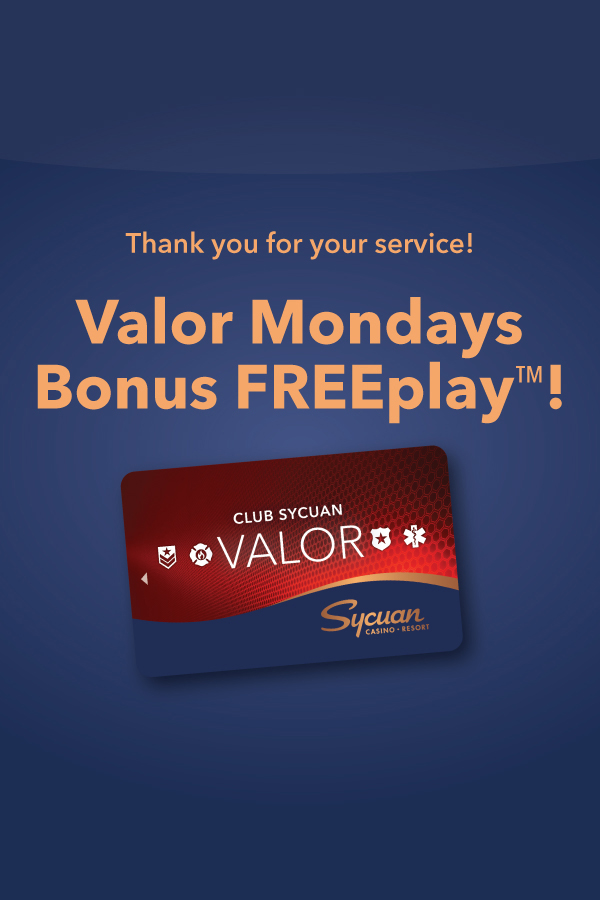 Valor Mondays Thank you for your service! Qualified Club Sycuan Valor members will automatically receive a Bonus FREEplay offer every Monday! View your new weekly offer in your monthly mailer, on MySycuan.com, or the Sycuan App. Enjoy a free appetizer at Rank & File or Viewpoint* or a free house coffee from Starbucks! Swipe your Club Sycuan card at any Club Sycuan kiosk to select your dining offer. *With a purchase of an entree. Open to Club Sycuan Valor members only. FREEplay offer is based on play. CLUB SYCUAN VALOR CARD BENEFITS You must be an active Club Sycuan Valor member to enjoy Valor perks, including Valor Mondays. See Club Sycuan for details. Please play responsibly. EXPAND FOR OFFICIAL RULES Valor Mondays May 5 – December 29, 2025 Official Rules 1. This promotion is open to current Club Sycuan Valor members only. Guests who are not Club Sycuan Valor members that would like to participate in this promotion can sign up for free to become a member at any Club Sycuan desk in the Casino with appropriate identification. 2. You must be 21 years of age or older and have a current government-issued picture identification to become a Club Sycuan member and to participate in this promotion. 3. Qualified Club Sycuan Valor members will receive a weekly FREEplay offer, viewable in their monthly mailer. a. Offers will be determined before the start of each month. b. FREEplay offers during this promotion are valid Mondays from 6AM-11:59PM. c. FREEplay offers can be Slot or Table Games, contingent with the Club Sycuan members monthly mailer offers. 4. Each Monday from 6:00am – 11:59pm, eligible participants may also select the “Valor Mondays Dining Offer” button to receive one (1) offer of their choice. Options will include: a. Free appetizer with the purchase of an entrée at Viewpoint Neighborhood Kitchen. b. Free appetizer with the purchase of an entrée at Rank & File. c. Free Grande House Coffee at Starbucks 5. Dining offers will automatically be placed on participant accounts at the time of selection and are valid during the Monday in which the guest participated through the following Tuesday, during food venue hours of operation, as listed below: a. Viewpoint Neighborhood Kitchen – 8AM-10PM b. Rank & File – Noon-Midnight c. Starbucks – 6AM-10PM 6. Club Sycuan Valor members can participate in the “Valor Mondays Dining Offer” promotion once each Monday. 7. “Valor Mondays Dining Offer” is non-transferable, non-negotiable and subject to availability and cannot be combined with any other offers and must be redeemed in person for dine-in only at Sycuan Casino Resort. Participant must provide Club Sycuan card and current government-issued photo identification at the time of redemption. 8. In the event of technical difficulty or mechanical failure, Sycuan Casino Resort may temporarily suspend this promotion until the problem is resolved. No rain checks will be issued during this time. 9. All winners are responsible for any applicable taxes, tax forms, fees, gratuities and other government imposed fees. If the cumulative total of the calendar year’s prizes should total $600 or more, a 1099 will be filed with the I.R.S. 10. Barred or excluded individuals are not eligible for FREEplay offers, promotions, or jackpot winnings. 11. Employees and their spouses of Sycuan Casino Resort, Singing Hills Golf Resort at Sycuan, Sycuan Gaming Commission or the Sycuan Tribe, as well as Sycuan Tribal members and their spouses, are not eligible for any Sycuan Casino Resort promotion. All licensed vendor employees who have been issued a permanent badge cannot participate in any Sycuan Casino Resort promotion while they are assigned to work at Sycuan Casino Resort. It is the responsibility of the player to apprise the promotion team that they are not eligible for the promotion. Failure to do so may result in rescindment of prize. 12. All winners agree to allow Sycuan Casino Resort to use their image and likeness for any future marketing and promotional purposes without further compensation to winner. 13. Participation in this promotion constitutes agreement to the above rules of the promotion. 14. Any participant found to be abusing Club Sycuan and/or promotion rules and/or tampering with the promotion in any way may be disqualified and declared ineligible for any prize. 15. Sycuan Casino Resort management has the right to modify or cancel this promotion at any time without advance notice. SYCUAN CASINO MORE PROMOTIONS Table Games Bonus Spin Blackjack LEARN MORE Join Club Sycuan Today! Join Club Sycuan Today! LEARN MORE Complimentary Sycuan App Complimentary Sycuan Mobile App LEARN MORE NOW - December 31 Match Your Average Bet Baccarat LEARN MORE VIEW ALL PROMOTIONS Gold† Membership Sign up for a Club Sycuan card today and you’ll automatically become a Gold cardholder. Platinum Membership When you earn 10,000 points* you’ll have access to all the casino benefits of the Gold card plus additional discounts at all our restaurants and more. Elite Membership Unlock even more casino rewards when you earn 65,000* points and receive Elite cardholder status. Diamond Membership Once you earn 200,000 points* you’ll receive cash back with as little as 2,000 points earned plus incredible offers & discounts. Black Membership Reserved for our top-tier points players who earn 500,000 points*. You’ll receive the best of the best when it comes to casino rewards. HINT: CLICK THE CARDS TO LEARN MORE JOIN THE CLUB SYCUAN GET A CARD. GET REWARDED. LEARN MORE ABOUT CLUB SYCUAN