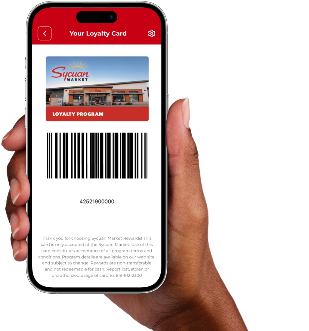 By enrolling your Sycuan Market Loyalty card through our mobile app or website, you will automatically be awarded 500 points.